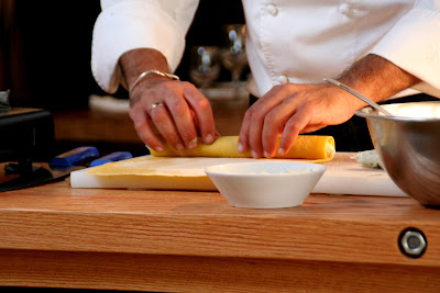 6. כאשר התערובת קרה מניחים שורה מהתערובת על גבי דפי הפסטה בעזרת כפית או בעזרת שק זילוף ומגלגלים