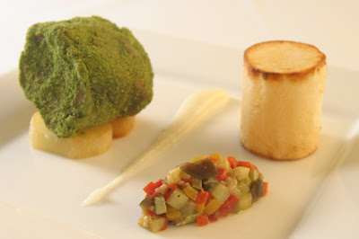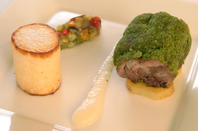 8. טובלים כל נתח בשר בפירורי הלחם הירוקים ומניחים על צלחת לצד תפוח אדמה קונפי ורטטוי (ראו הצעת הגשה בתמונה), והרי לכם מנה פרובנסאלית אמיתית בלי לנסוע לפרובאנס.
