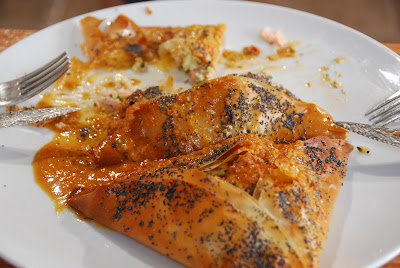 7. להבריש את דפי הפילו גם מבחוץ. לזרות את הפרג ולאפות בתנור שחומם מראש ל-180 מעלות למשך 12-15 דקות, או עד שהפילו מזהיב.
