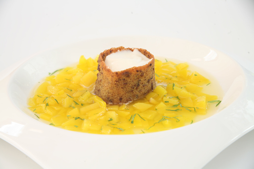 יוצקים כף מהמינסטרונה מנגו בצלחת מרק ובמרכז מניחים כף מוס קוקוס.מגישים.