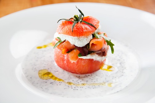 עגבנייה במילוי גבינת שמנת וסלמון מעושן ברוטב יוגורט ופרג: